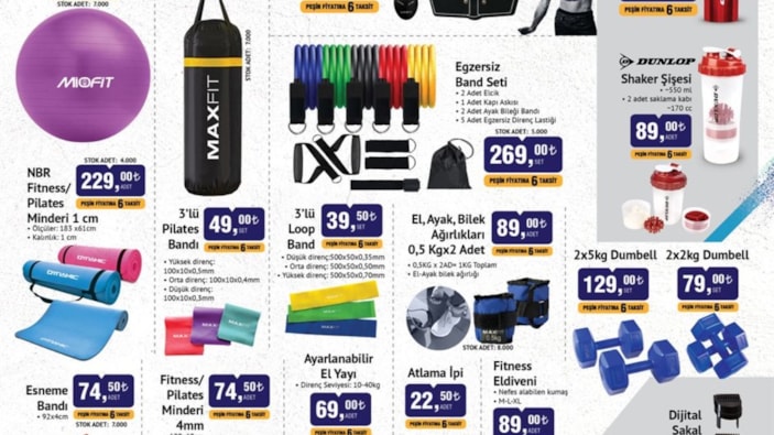 Pilates topu, boks torbası, spor çanta, spor tayt, masaj aleti, dambıl, bant gibi birçok ürün indirimli fiyatlarla satışta olacak.