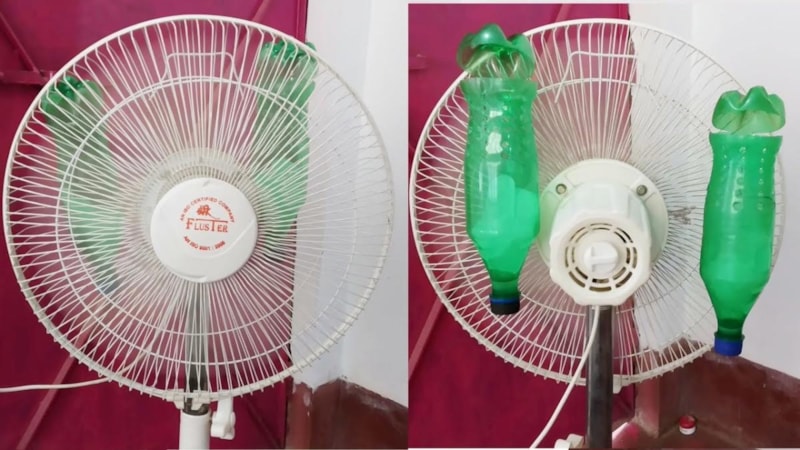 Küçük noktalar açmanız gerek. Bu şişeleri vantilatörün arka kısmına bağlayın. Sabitledikten sonra içerisine buz doldurun.