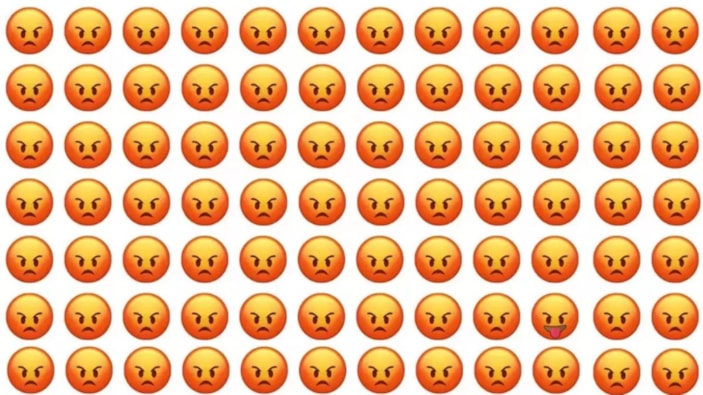 Resimde bulunan onlarca kızgın surat emojisi arasında bir tane farklı emoji yer alıyor.