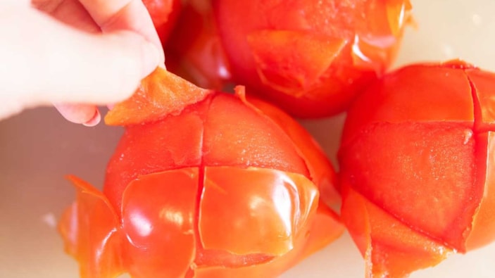 Domatesleri iyice yıkayın. Kabuklarını soyun ve büyük parçalar halinde kesin.