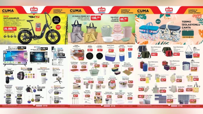 BİM’in 13-16 Mayıs 2025 tarihli aktüel ürünler kataloğu açıklandı. 16 Mayıs itibarıyla satışa sunulacak ürünler arasında piknik ürünlerinden, ev aletlerine onlarca ürün yer alıyor. İşte BİM 16 Mayıs aktüel katalog…