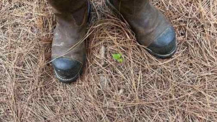 Kuru çam iğneleri ve çizmeleriyle ayakta duran bir adamın yer aldığı bu resimde, göz önünde ustaca saklanan bir yılan var. Şimdi onu fark etme sırası sizde.