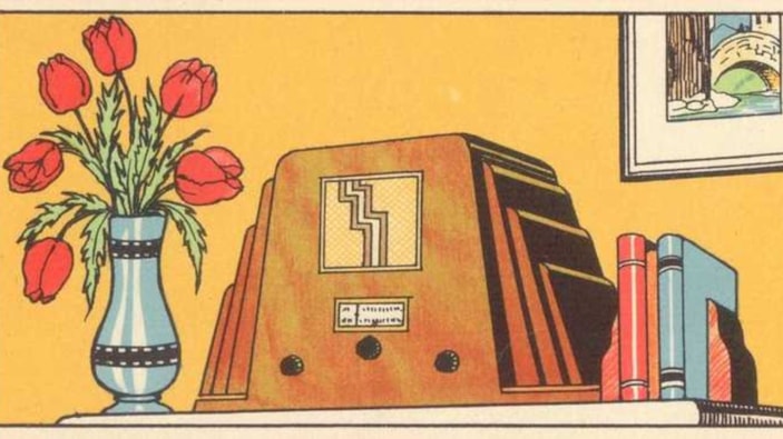 Yukarıda paylaşılan fotoğrafta, radyo ve çiçek vazosu bulunan eski bir kartpostal görülüyor. Çiçek lalelerle dolu. İlk bakışta her şey gayet normal görünüyor, değil mi?