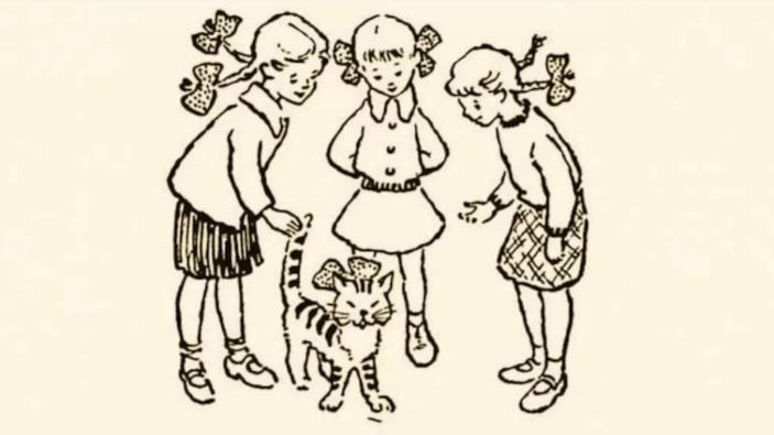 Yukarıdaki resmin ortasında bir kedi, etrafında ise üç kız yer alıyor. İçlerinden biri kedinin sahibi.