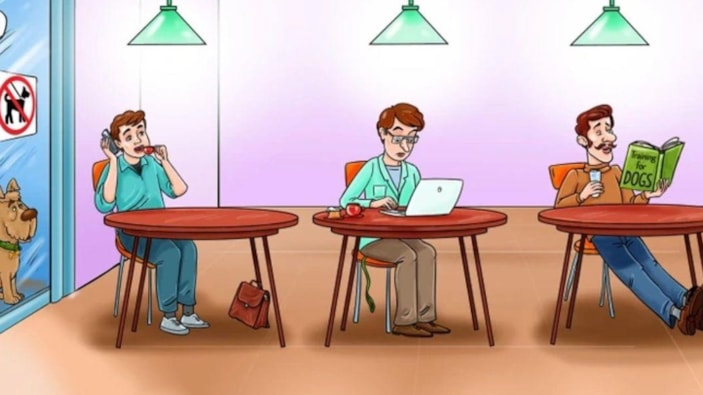 Bu IQ testinde kafe önünde bekleyen bir köpek var. Bu köpeğin sahibi ise içeride oturuyor. Peki bu 3 adamdan hangisi köpeğin sahibi?
