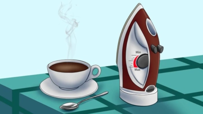 Resimde bir fincan sıcak kahveyi bir fincan tabağına yerleştiriyoruz. Fincanın yanında bir de ütü var.