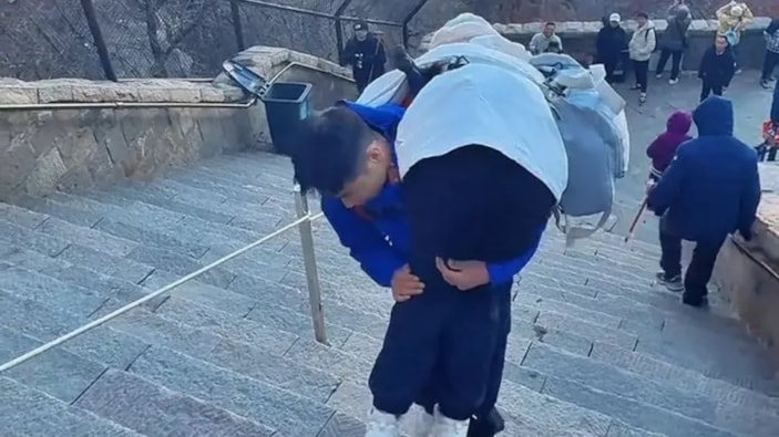 Bir turistin son 1.000 basamaktaki tırmanışını kucaklayarak taşıması ise Chen'in yaklaşık yarım saatini alıyor.