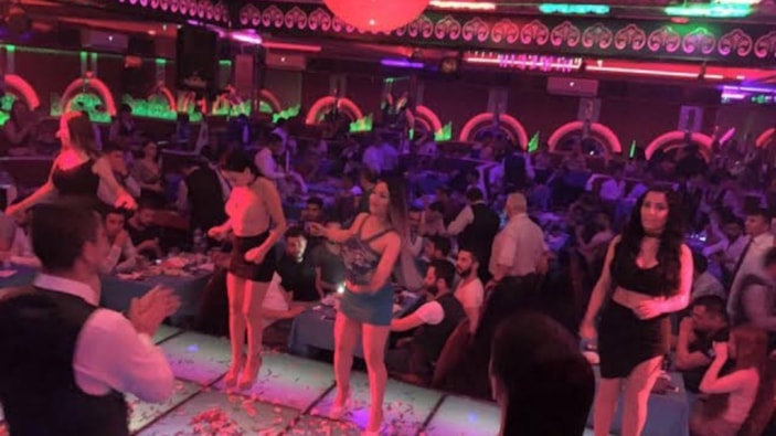 Pavyonda çalışan, masalara gelen ve dans eden kadınlar dikkat çekmektedir.