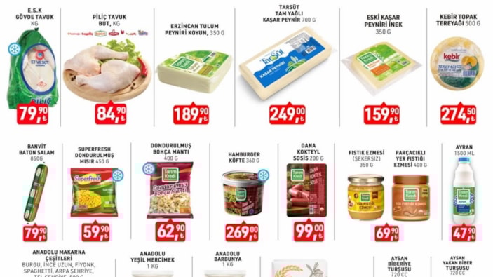 Süt, peynir, tereyağ, tavuk bir yana; çamaşır deterjanı, bulaşık kapsülleri, yüzey temizleyiciler ve hijyen ürünlerinde geniş bir ürün yelpazesi sunuluyor.