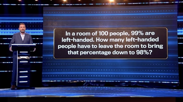 “100 kişilik bir odada %99 solak oranı, bu oranı %98’e düşürmek için kaç kişi çıkmalı?” sorusu, İngiltere’de bir yarışma programında gündem oldu. İşte soru ve çözümü.