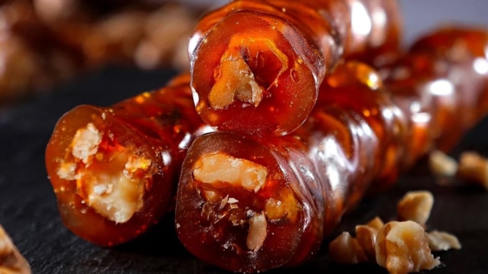 Çayın yanında lezzetli bir tatlı atıştırmalık olan cevizli sucuk, evde de basitçe yapılabilir.