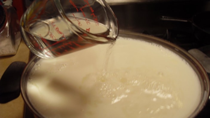 Sirkeyi suyla karıştırın ve ısınan sütün içine ekleyin. Karıştırın ve birkaç dakika bekleyin. Süt pıhtılaşmaya başladığında, tahta bir kaşık kullanarak karışımı nazikçe karıştırın.