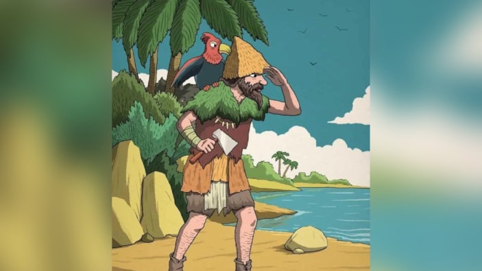 Yukarıda paylaşılan görselde, elinde balta, omzunda kuş olan bir adamın birini aradığı bir ada sahnesi yer alıyor.