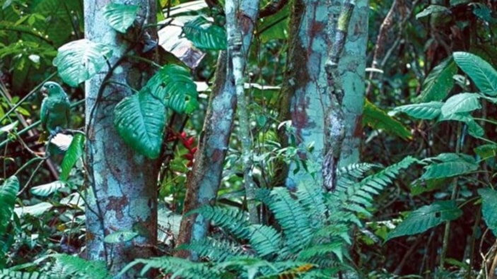 Resimde yeşil bir ormanlık alan yer alıyor. Ve bu görselde yeşil ağaçların arasına gizlenmiş bir kuş var.