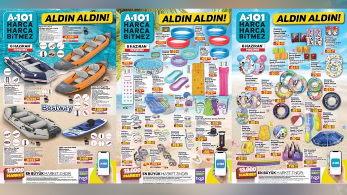 Bu haftaki indirimli ürünler arasında çocuk yüzme havuzu, bot, kano, plaj şemsiyesi, can simidi ve deniz yatağı gibi yazın vazgeçilmezleri bulunuyor.