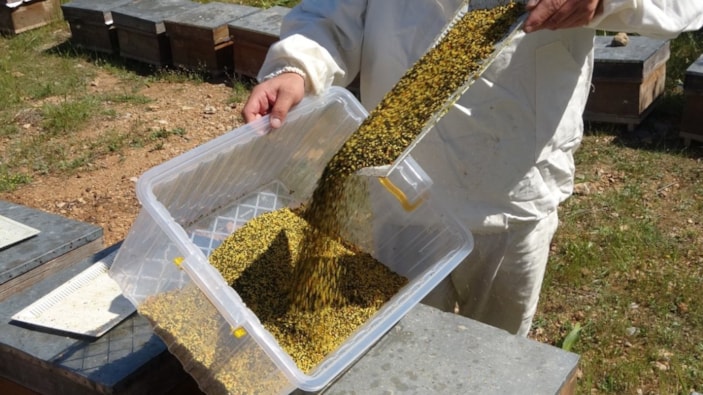 Kilogram fiyatının bin 300 TL civarında olduğu belirtilen polen, doğal protein olarak dikkat çekiyor.