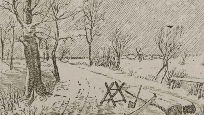 Siyah ve beyaz tonların hakim olduğu bir resimde, tam da doğanın içinde bir orman sahnesi canlanıyor. Bu manzara içinde odun kütükleri ve bir balta dikkat çekiyor.