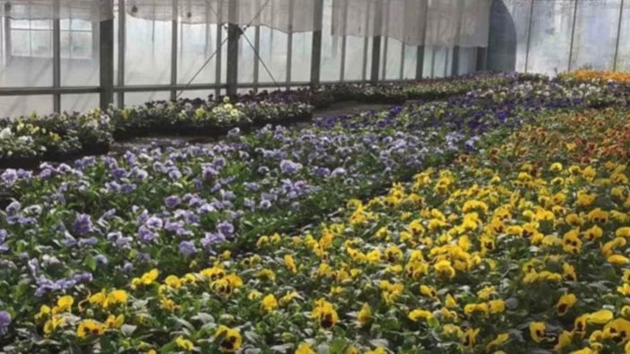 Yukarıdaki resimde rengarenk çiçeklerle dolu bir sera yer alıyor.