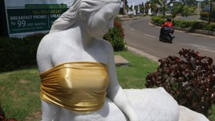Dünyanın en büyük Müslüman nüfusa sahip ülkesi olarak bilinen Endonezya'nın başkenti Cakarta'daki Ancol Dreamland adlı eğlence parkında, yaklaşık 15 yıldır bulunan denizkızı heykellerinin çıplak göğüsleri, altın renginde bezlerle örtüldü.