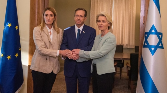 İsrail ordusunun Gazze'ye saldırılarının yoğunlaştığı bir dönemde görüşen Herzog, Leyen ve Metsola, ortak açıklama yapmak üzere kameraların karşısına geçti.