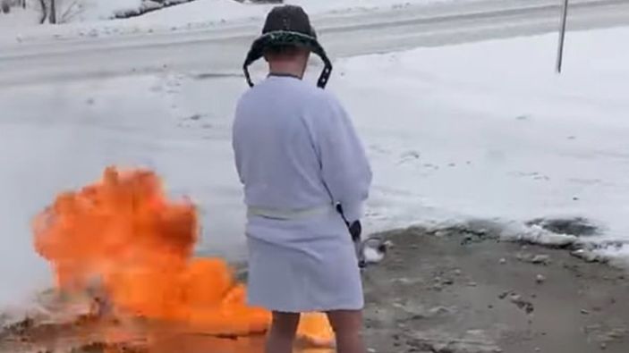 Sosyal medyada paylaşılan görüntülerde Timothy Browning adındaki bornozlu adam, alev püskürten aracıyla yerdeki beyaz örtüyü kısa sürede temizledi.