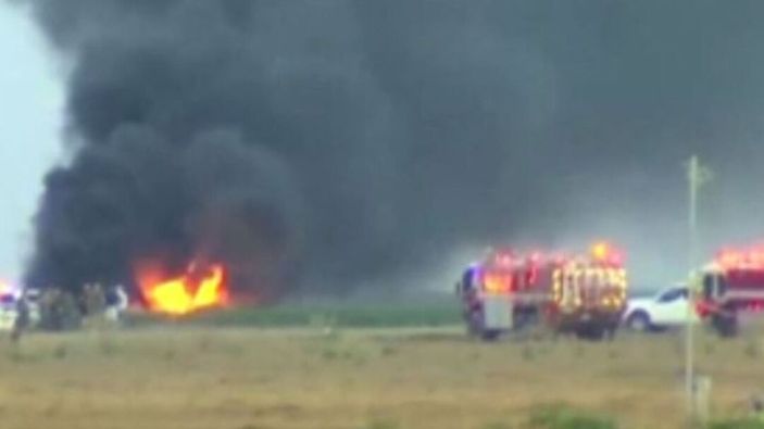 Olay yeri görüntülerinde, uçağın düştüğü açık alanda alev ve yoğun dumanın yayıldığı görüldü.
