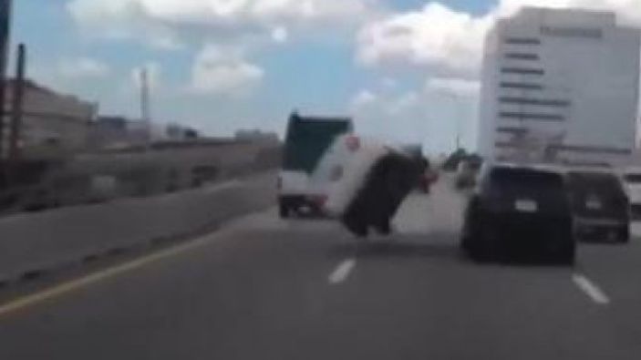 Florida eyaletinde, otobanda giden bir araç sollama yaparken yandaki araca çarptı. Çarpmanın etkisiyle havalanan araç ters döndü. O anlar, arkadaki aracın kamerasına yansıdı.