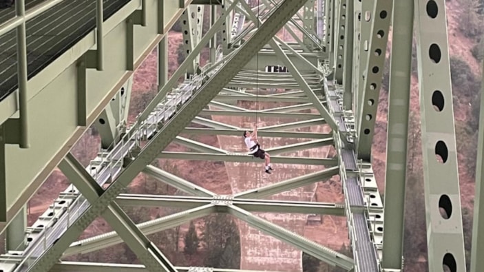 “Yapılan incelemede, 19 yaşındaki bir kişi ve 17 yaşındaki arkadaşının köprünün altında sallanırken gösteren bir video çekmek için orada oldukları öğrenildi. 19 yaşındaki genç, ekipmanı arızalanınca köprünün altındaki hizmet yolundan yüksekte asılı kaldı. Arkadaşı gencin sıkışıp kaldığını ve yardıma ihtiyacı olduğunu anlayınca 911'i aradı.”