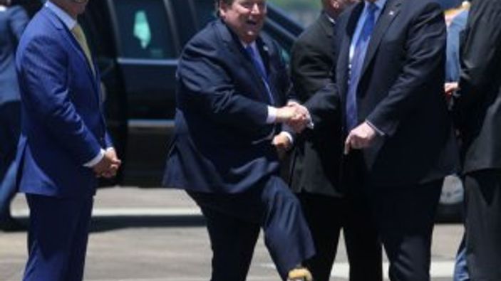 ABD Başkanı Donald Trump'ı karşılanaya giden Louisiana Vali Yardımcısı Billy Nungesser, Trump'ın portresinin yer aldığı ve saçlarının uçuştuğu bir çorap giydi.