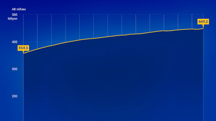 Avrupa Birliği'ne üye 27 ülkenin toplam nüfusu 2024 yılı itibarıyla 449,2 milyon oldu.