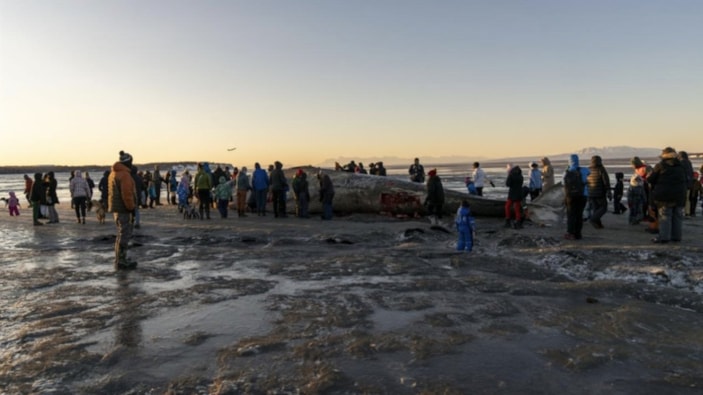 Anchorage kentindeki Cook Inlet sahilinde, dev balina karaya vurdu.