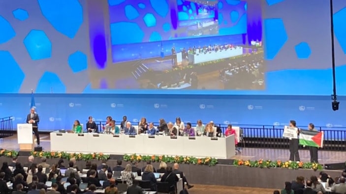 İsrail'in saldırıları altındaki Filistin topraklarında yaşananlara karşı seslerini yükselten protestocular, bu kez Birleşmiş Milletler (BM) İklim Konferansı'nda sahneye çıktı.