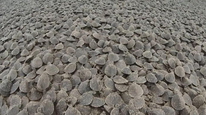 Kaplumbağın sahili kapladığı anlar görenleri şaşırttı. WCS Brezilya koruma uzmanları, plajdan birkaç gün içinde yaklaşık 100 bin kaplumbağa yavrusunun sahile çıktığı belirtti.