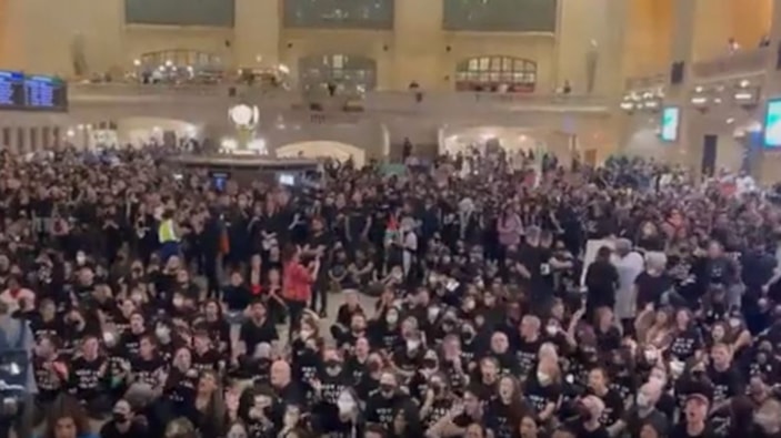 ABD'de 'Barış için Yahudi Sesi' (JVP) adlı oluşum, New York'un en büyük tren istasyonu Grand Central'ın yolcu salonunda bir araya geldi.