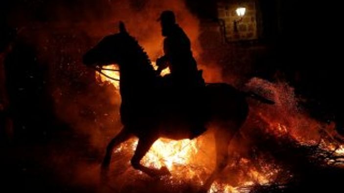 İspanya'nın San Bartolome de Pinares kasabasında yapılan "Las Luminarias" adlı etkinlikte, yaklaşık 300 yıldır yaşatılan gelenek çerçevesinde, kötülüklerden arınma ve salgın hastalıklardan korunma inancıyla atlar ateş üzerinde yürütüldü.