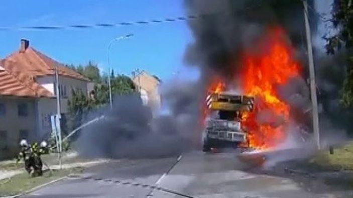 Çekya'da yanan bir kamyona müdahale eden itfaiye ekipleri, yaşanan patlama ile fırlayan tekerleğin altında kalmaktan son anda kurtuldu.