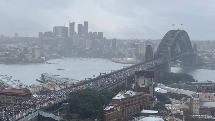 Avustralya'nın New South Wales eyaletinde, ülkenin simgesi olan ünlü Sydney Harbour Köprüsü'nde, Filistin'i destekleyen binlerce Avustralyalı şiddetli yağmura rağmen Gazze için toplandı.