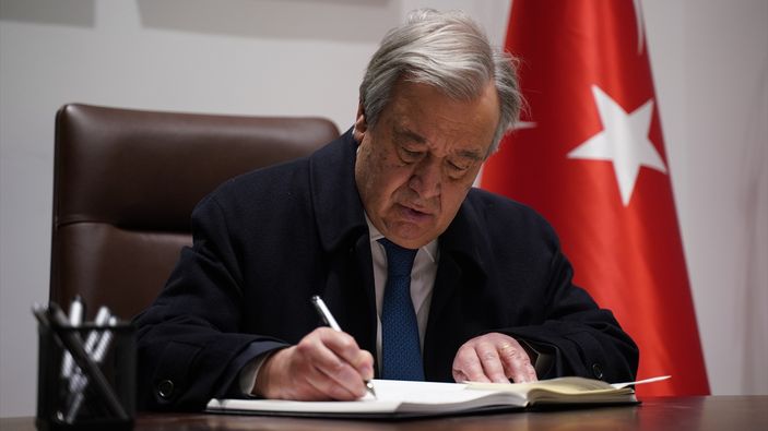 Kahramanmaraş merkezli depremler sonrası Birleşmiş Milletler (BM) Genel Sekreteri Antonio Guterres, New York'ta Türkiye'deki depremler için açılan taziye defterini imzaladı.