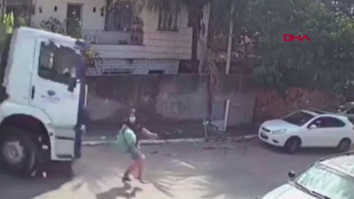 Brezilya’da yolda ilerleyen kadın, freni boşalan çöp kamyonunun altında kalmaktan son anda kurtuldu.