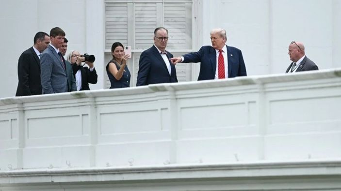 Trump çatıda yürürken, kısa süre önce duyurulan Beyaz Saray'a eklenecek yeni balo salonuna ilişkin bazı el hareketleriyle açıklamalar yapmaya çalıştı.