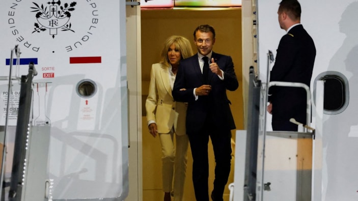 Başkent Jakarta'ya inen Macron çifti, tokat dedikodularını gölgelemek için uçaktan kol kola indi.