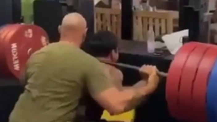 Yardımcı antrenörünün desteğiyle yükün altına giren vücut geliştirme sporcusunun kafası halter çubuğunun altında kaldı.
