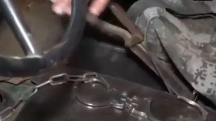 Hava operasyonlarıyla direnci kırılan Ermenistan'ın ele geçirilen araçlarında kaydedilen görüntülerde, askeri araçların şoförlerinin araca kelepçelendiği ortaya çıktı.