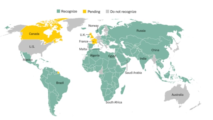 (Yeşil işaretli ülkeler, Filistin devletini güncel olarak tanıyor. Sarı işaretli ülkeler ise kısa süre içinde tanıyacaklarını açıkladı.)