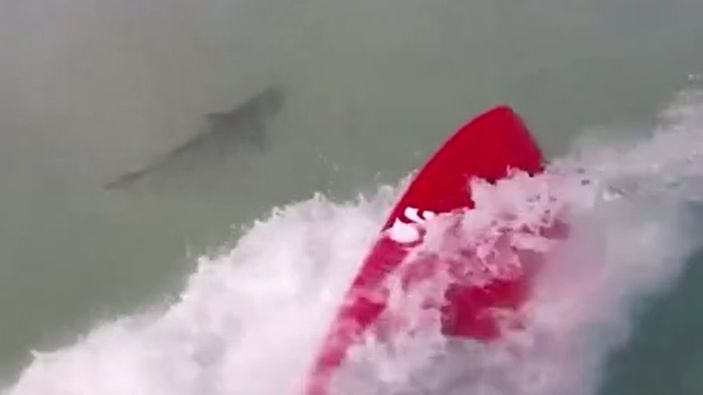Görüntülerde köpek balıklarının zaman zaman sörfçüye yaklaşıp, uzaklaştığı görüldü.