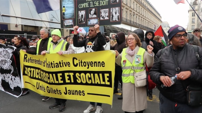 Omuzlarında Filistin bayrağı taşıyan gösterici Catherine Lassure ise, sarı yeleklilerin, Macron iktidarına ve bu iktidarın "topluma zararlı politikalarına" karşı protesto düzenlediklerini söyledi.