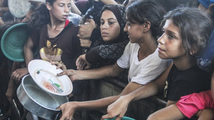 Gazze'ye gelen yardımlara koşan ve bir kap yemeğe ulaşmaya çalışan Filistinlilerin durumu, görenlerin yüreğini parçalıyor.