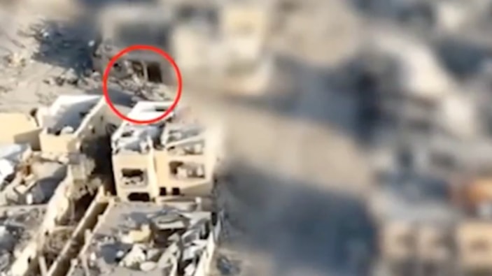Görüntülerde ilk olarak, Hamas lideri Yahya Sinvar'ın yerinin drone ile tespit edilerek sonrasında tank ile vurulduğu görülüyor.
