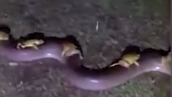 Avustralya'da bir saat süren aşırı yağışın ardından yükselen göl suyundan kurtulmak isteyen kara kurbağaları 3.5 metre boyundaki pitonun sırtına binerek hayatta kaldı.