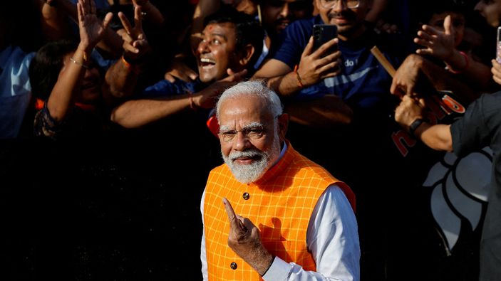 Bharatiya Janata Partisi (BJP) lideri Modi, oyunu kullandıktan sonra kameralara poz verdi.